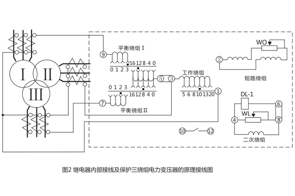 不要改變繼電器能牌上的指針的位置(不要離開(kāi)能牌刻度)或不動(dòng)指針而去動(dòng)彈簧固定螺絲。這樣做將惡化躲開(kāi)磁化電流或不平衡電流非周期分量影響的能力或者當(dāng)發(fā)生保護(hù)區(qū)內(nèi)短路時(shí)減小繼電器的可靠系數(shù)。 變流器接線示意圖1 , 及其保護(hù)三繞組電力變壓器時(shí)繼電器對(duì)外接線圖如圖2。