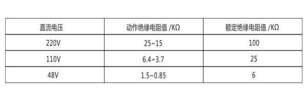 繼電器動作值:當母線任何一側對地絕緣電阻下降到下表規定值時,繼電器應可靠動作。